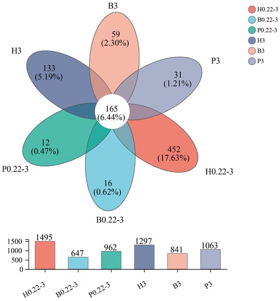 At the OTU level, the biofloc technology samples had the lowest OTU diversity at both the free-living and particle-attached grain levels. The distribution of unique OTUs for the six groups of samples was 452 (H0.22-3), 16 (B0.22-3), 12 (P0.22-3), 133 (H3), 59 (B3), and 31 (P3). The highest number of unique OTUs (452 vs. 133) was found in the high-level pond samples for both the free-living and particle-attached samples (see Figure 3). This may be related to the relatively open culture pattern in the pond culture.