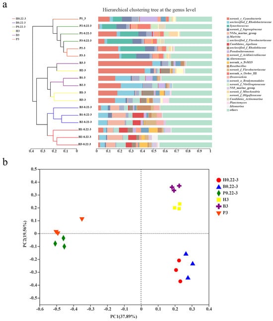 To investigate the similarities and differences in community composition among the different samples, a Beta-diversity analysis was conducted to compare the diversity of the microbial communities among the different culturing modes and different grain sizes. Hierarchical clustering analyses at the genus level revealed that parallel samples of free-living and particle-attached grains from the pond culture clustered in a large branch. Distinctly, the parallel samples of free-living grains from the high-level pond and those from the biofloc technology aquafarms were each clustered separately in a small branch, which subsequently merged into a larger branch. Interestingly, the particle-attached grain samples from both the high-level pond and the biofloc technology aquafarms were cross-clustered in one large branch (Figure 4a).