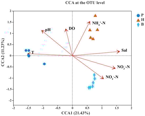 The results of the CCA and VPA analyses show that among the seven environmental factors, there are three key environmental factors that cause differences in the three different aquaculture communities, namely, NH4+-N, salinity (Sal), and NO3−-N. Among the single environmental factors’ separate influences on the bacterial community, NH4+-N has the greatest influence, followed by salinity (Sal) and then NO3−-N. In terms of the combined influence, salinity (Sal) has the greatest degree, followed by NO3−-N and then NH4+-N.