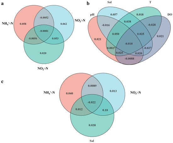 In order to further analyze the influence degree of the three most important environmental parameters (NO3−-N, NH4+-N, and Sal) on the community structure individually, NO3−-N, NH4+-N, and Sal were set up as a group of environmental factors, and a VPA was carried out. The results showed that the three most important environmental parameters individually affected the community in the order of NH4+-N (4.0%) > Sal (3.8%) > NO3−-N (1.3%) (Figure 6c). The co-resolution was Sal (13.1%) > NO3−-N (10.2%) > NH4+-N (3.9%) (Figure 6c).