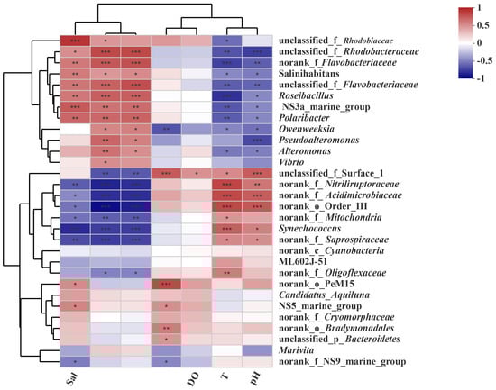 Among the top 30 genus-level microorganisms, Salinihabitans, Roseibacillus, NS3a_marine_group, Polaribacter_4, Owenweeksia, Pseudoalteromonas, Alteromonas, and Vibrio displayed a negative correlation with the environmental factors of temperature (T) and pH, while they were positively correlated with salinity (Sal), NO3−-N, and NO2−-N. Conversely, they showed a lesser correlation with NH4+-N and DO. In contrast, Synechococcus was positively correlated with T and pH but negatively with Sal, NO3−-N, and NO2−-N. Additionally, Marivita was negatively related to Sal, NH4+-N, and pH, was positively linked to NO3−-N and NO2−-N, and demonstrated a weak correlation with T. Researchers uncovered that particles ranging from 10 to 100 μm were significantly correlated with environmental factors, and in biofloc technology culture water, microbial abundance was inversely correlated with T and Sal, while it was positively correlated with NH4+-N and DO [].