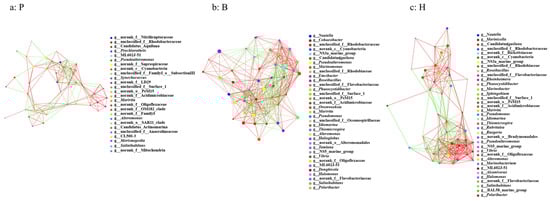 The analysis of the samples can identify both positive and negative correlations, as well as significant associations, among the interactions between the various species present. Network analyses enable the identification of species coexistence within environmental samples, the interaction among species in the same environment, and the composition of pivotal species, thereby elucidating the underlying mechanisms of the formation of differences between samples [,]. Figure 8 illustrates an intricate network diagram of the microbial communities, wherein the line colors symbolize correlation types: red represents positive correlations, while green denotes negative correlations. Each node represents a distinct OTU. Notably, the analysis reveals that the correlations among the species within the communities of the three cultivated water samples are predominantly positive in nature.
