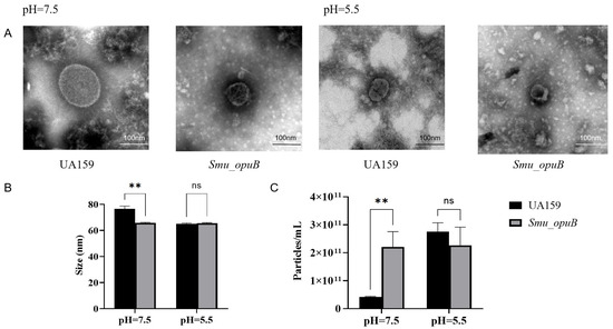Nanoflow cytometry was used to determine the concentration and size distribution of MVs produced by Smu_opuB and UA159 under both neutral (pH 7.5) and acidic (pH 5.5) conditions (Figure 1B). At pH 7.5, Smu_opuB produced smaller (65.77± 0.47 nm) and a higher concentration of MVs (about 2.21 × 1011 ± 0.55 × 1011 vesicles/mL) compared to UA159 (about 76.5 ± 2.19 nm, 0.42 × 1011 ± 0.21 × 1011 vesicles/mL). However, under acidic conditions (pH 5.5), there was no statistical difference in concentration and particle size between the two.