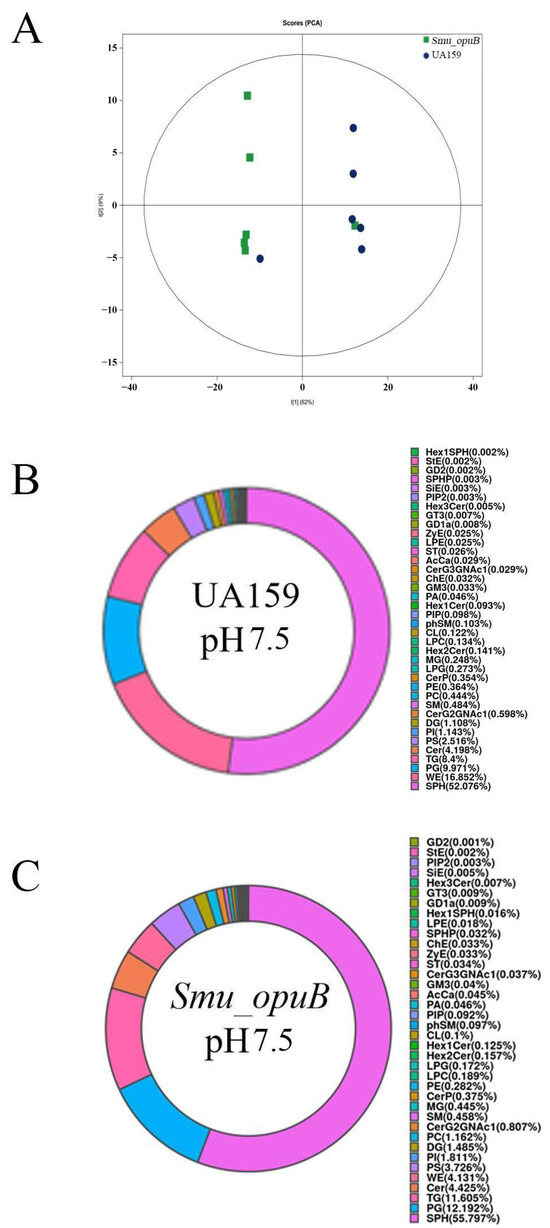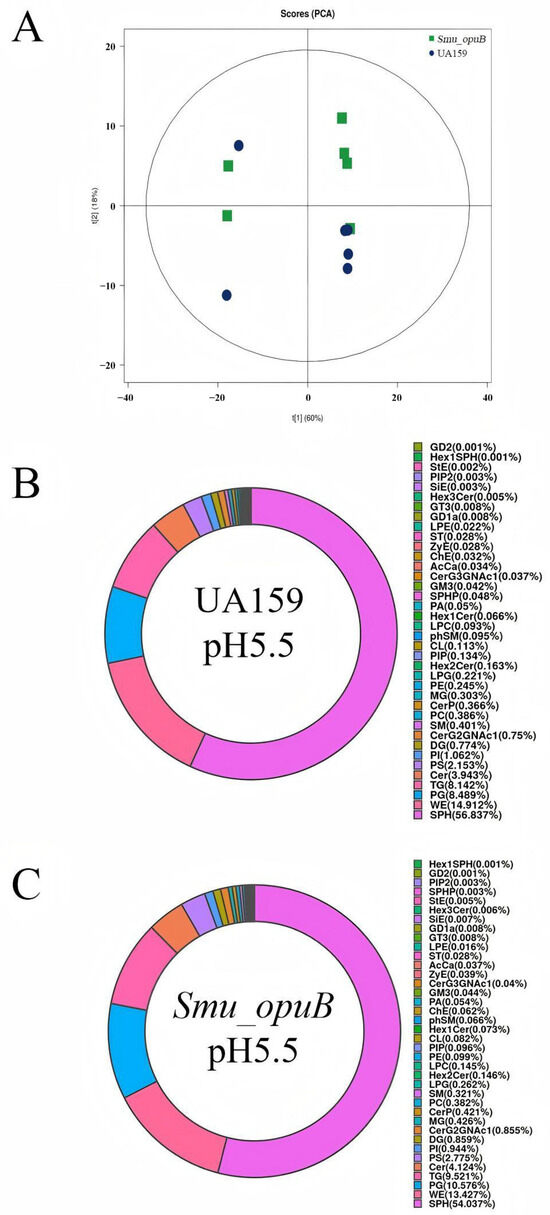 Lipidomic analysis of MVs produced by Smu_opuB and UA159 under acidic conditions. (A) PCA score plot of non-targeted lipidomics data. (B) Lipidomic profile (lipid classes) of MVs produced by UA159 under acidic conditions, shown as a pie chart. (C) Lipidomic profile (lipid classes) of MVs produced by Smu_opuB under acidic conditions, shown as a pie chart.