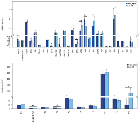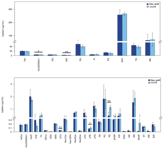 Significant differences in lipidomic profiles (lipid class) between MVs produced by Smu_opuB and UA159 under neutral conditions (selected VIP total >1 and p value < 0.05). n = 6. Data are expressed in all panels as mean ± S.D.: * p < 0.05, ** p < 0.01 (Student’s t-test).
