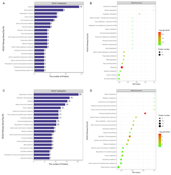 The top 20 KEGG pathways were mapped. In a neutral environment, ribosomes included the greatest number of proteins (14 proteins), followed by ABC transporters (9 proteins), biosynthesis of cofactors (7 proteins), quorum sensing (7 proteins), and two-component system (6 proteins) (Figure 9A). Among these, two pathways were enriched in terms of their effect on adapting to a neutral environment, including ribosome and quorum sensing. The detailed information for the KEGG enrichment is presented in Figure 9B.