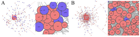 The PPI network analysis. (A) PPI network of the proteins of MVs produced by Smu_opuB and UA159 in a neutral environment. (B) PPI network of the proteins of MVs produced by Smu_opuB and UA159 in an acidic environment.