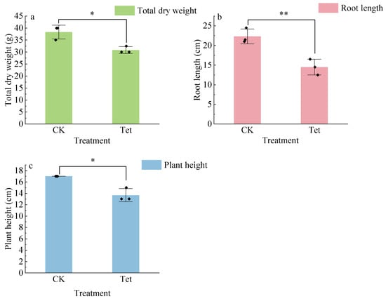 The dry weight, root length, and plant height of E. crassipes were significantly affected by Tet stress. As shown in Figure 1, the total dry weight was significantly lower in Tet treatment than the CK. Compared to the CK, root length and plant height in Tet treatment significantly decreased by 58.5% and 32.3%, respectively.