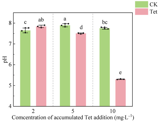 Compared to the CK, the pH in the rhizospheric water gradually decreased in Tet treatment (Figure 2). The pH in the CK stayed relatively stable, while a significant decline was observed in Tet treatment. When the accumulated Tet concentration reached 10 mg·L−1, the pH dropped to 5.30, which was significantly lower than that of the CK (pH = 7.76). The sign of root decay was observed when the accumulated Tet concentration reached 10 mg·L−1 during the experiment.