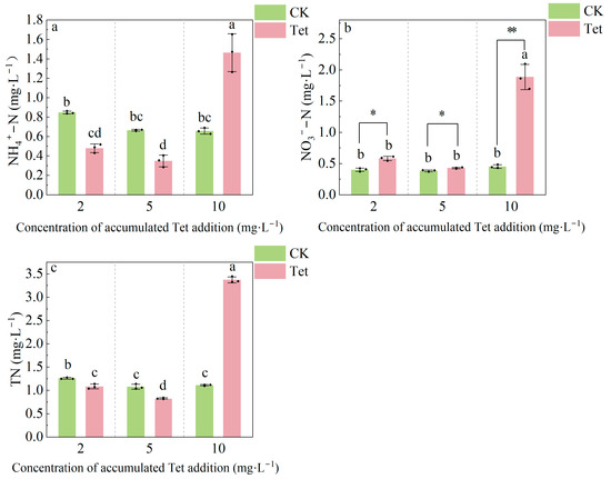 As shown in Figure 3, the concentrations of NH4+-N, NO3−-N, and TN in the CK remained relatively stable. In contrast, NH4+-N, NO3−-N, and TN levels initially decreased in Tet treatment then sharply increased as accumulated Tet addition increased. The concentrations of NH4+-N, NO3−-N, and TN declined when the amount of Tet concentration accumulated from 2 mg·L−1 to 5 mg·L−1. However, the concentrations of NH4+-N, NO3−-N, and TN significantly increased upon a further increase in Tet concentration to 10 mg·L−1.