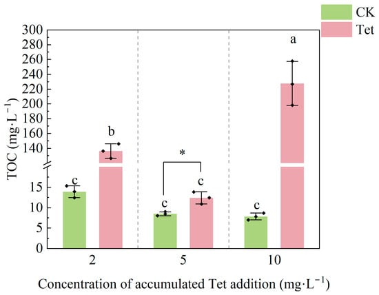 As shown in Figure 4, the TOC concentration significantly fluctuated under Tet stress. When the accumulated Tet concentration increased from 2 to 5 mg·L−1, the TOC concentration suddenly dropped by one order of magnitude. However, when the accumulated Tet concentration increased from 5 to 10 mg·L−1, the TOC concentration significantly increased, which was accompanied by a sign of root decay, leading to a substantial rise in the TOC concentration in the rhizospheric water. In contrast, the TOC concentration in the CK showed a sign of decreasing trend, while no significant difference was observed.