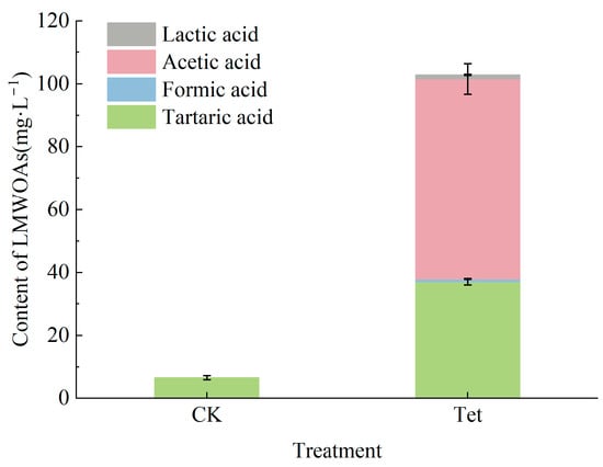 Under Tet stress, the composition and concentration of low-molecular-weight organic acids (LMWOAs) in the rhizospheric water changed significantly (p < 0.05), as shown in Figure 5. The tartaric acid was the only detected organic acid in the CK, with a concentration of 6.52 ± 0.68 mg·L−1. In contrast, four types of LMWOAs, namely, tartaric acid, formic acid, acetic acid, and lactic acid, were detected in Tet treatment, with concentrations of 36.99 ± 1.00, 0.90 ± 0.13, 63.62 ± 4.87, and 1.35 ± 0.21 mg·L−1, respectively, leading to a significant increase in the total amount of organic acids. The concentration of tartaric acid under Tet treatment conditions increased significantly compared to the CK. The acetic acid showed the highest concentration among all LMWOAs detected in the present study.