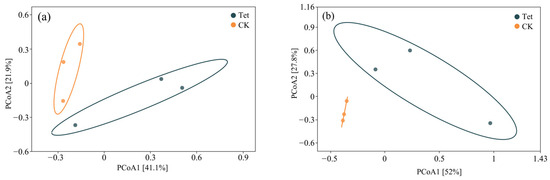 PCoA of microbial community composition based on the Bray–Curtis distance matrix. (a) Water microbial communities, (b) rhizospheric microbial communities under Tet stress and in the CK. CK represents the control group (no Tet), and Tet corresponds to the accumulated tetracycline treatment.