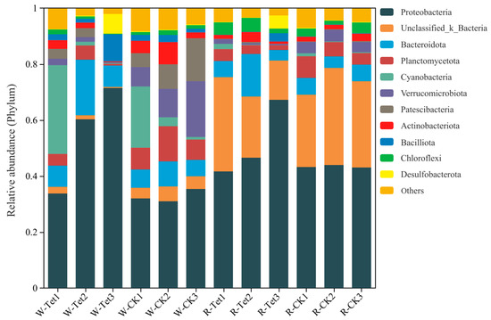 Relative abundance of dominant microbial taxa at the phylum level in water (W) and root (R) samples under control (CK) and Tet treatment conditions on Days 3, 9, and 19, corresponding with Tet accumulated concentrations of 2, 5, and 10 mg L−1, respectively. W-Tet1, W-Tet2, W-Tet3, W-CK1, W-CK2, and W-CK3 represent water samples, and R-Tet1, R-Tet2, R-Tet3, R-CK1, R-CK2, and R-CK3 represent root samples. CK represents the control group (no Tet), and Tet corresponds to the accumulated tetracycline treatment. The vertical axis represents the relative abundance of each major microbial community at the phylum level.
