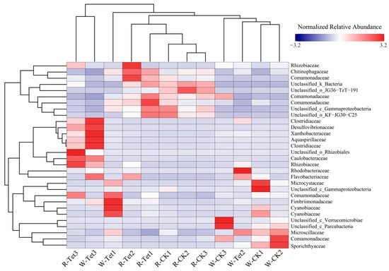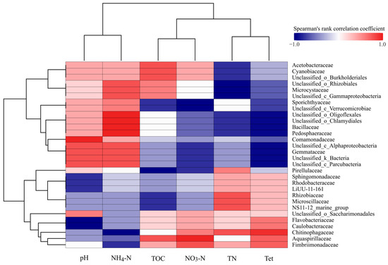 To further explore microbial responses to environmental factors, correlations between family abundance and key environmental variables were analyzed (Figure 9). The heatmap highlights relationships between the top 30 families and environmental factors, namely, pH, NH4+-N, TN, NO3−-N, TOC, and Tet.