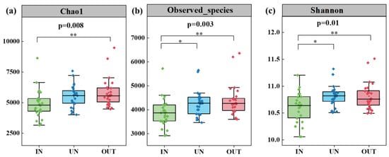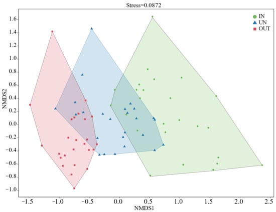 Compared with the IN zone, the Chao 1 index of bacteria in the OUT zone has significantly increased (Figure 2a, p = 0.008). In addition, the observed species index and the Shannon index showed the same tendency. These two indices in the UN zone and the OUT zone were significantly higher than those in the IN zone (Figure 2b,c, p < 0.05). The NMDS showed that the bacterial compositions in the IN zone differed from that in the OUT zone at the OTU level (Figure 3; stress = 0.0872), and PERMANOVA further confirmed that the Bray–Curtis distance between soil samples was greater than that within soil samples at the OTU level (R = 0.324, p = 0.001) (Table S1).