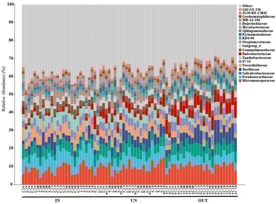 Relative abundance of the bacterial communities at the family level in three different zones of the N. splendens ring (IN: inside the ring, UN: under the ring, and OUT: outside the ring).