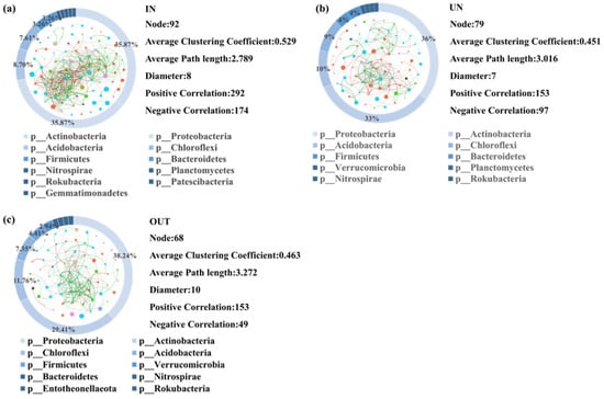 A network was constructed to visualize all correlations between microorganisms of the three different zones (Figure 5). A total of 92 nodes between microorganisms were detected in the IN zone. Among them, there were 292 positive correlations and 174 negative correlations (Figure 5a). The Proteobacteria and Actinobacteria phyla of microorganisms accounted for the largest proportion in network analysis, with 35.87% relative abundance in the IN zone (Figure 5a). There were 79 nodes between microorganisms in the UN zone, of which 153 were positively correlated, whereas 97 were negatively correlated (Figure 5b). Proteobacteria and Actinobacteria phyla of microorganisms still occupied the largest proportion in network analysis, with 36% and 33% relative abundance in the UN zone, respectively (Figure 5b). Furthermore, a total of 68 microbial nodes were found in the OUT zone, of which 153 were positively correlated and 49 were negatively correlated (Figure 5c). Similar to the IN and UN zones, Proteobacteria and Actinobacteria phyla of microorganisms had the greatest contribution in network analysis, with 38.24% and 29.41% relative abundance in the OUT zone, respectively (Figure 5c).