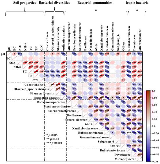 Pearson correlation heatmap shows the relationship between soil physicochemical properties, bacterial classification at the family level, bacterial diversity indices, and iconic bacteria. EC: soil electrical conductivity; TC: soil total carbon; TN, soil total nitrogen; and C/N ratio: soil carbon/nitrogen ratio. Red ellipses sloping up indicate a positive correlation, while blue ellipses sloping down indicate a negative correlation. The width of the ellipse indicates the level of correlation. *, **, and *** indicates statistical significance of the path at the p < 0.05, p < 0.01, and p < 0.001 levels, respectively.