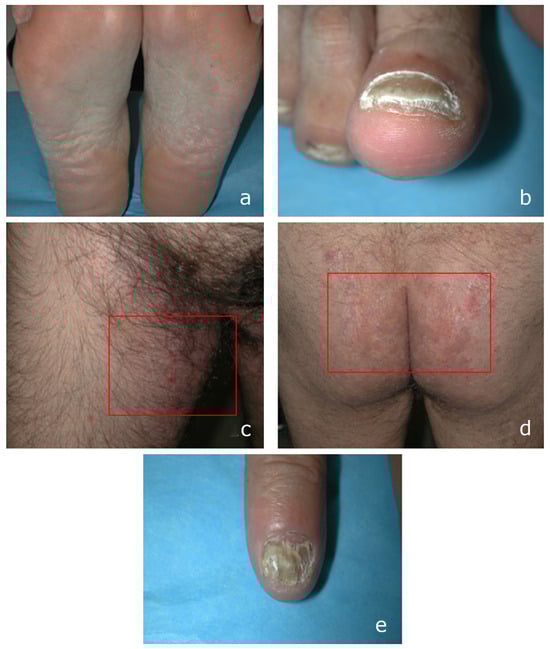 Clinical background and findings. The first patient, a 48-year-old Caucasian male, only reported erythematous and desquamative lesions on the soles of his feet, which had persisted for a minimum of 8 months (Figure 1a). Prior evaluations by a general practitioner in other facilities led to a diagnosis of dyshidrosis of the feet, for which he was treated with a steroid cream; however, this treatment proved ineffective. Additionally, localized lesions had developed on the toenail plates (Figure 1b) over the past four weeks. These new manifestations prompted the patient to seek consultation at the dermatology department of San Lazzaro Hospital. Regarding the present and following a closer inspection, the groin–crural site (Figure 1c), as well as the buttocks (Figure 1d), had erythematous and scaling lesions. Hyperkeratosis and distal onycholysis were detected on the fingernail plate (Figure 1e). The referral did not reveal any underlying pathologies. Dermatologists assumed a diffuse mycosis, in particular, dermatophytosis, and proposed a therapy with topical azoles (sertaconazole nitrate cream 2%, two applications/day) on the area of the affected skin and on the immediately adjacent area, and systemic terbinafine hydrochloride 250 mg/die. A short-term follow-up was 12 and 24 weeks. This new therapy allowed the clinical healing of all lesions and negative culture findings after 12 weeks.