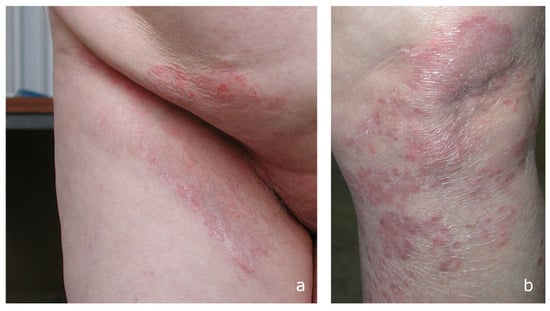 There are also cases of a specific type of glabrous skin dermatophytosis that has been altered in appearance because of the incorrect use of corticosteroids, either topically or systemically, for the treatment of other conditions. Patients 3 and 4 are included in this category. For rheumatoid arthritis and psoriasis, both patients were given oral or topical corticosteroids, respectively. In these circumstances, tinea tends to become chronic and to extend, mimicking a variety of skin diseases such as psoriasis, rosacea, systemic lupus erythematosus, and other forms of eczema [3,35]. In these circumstances, a mycological analysis is essential and should always be performed on any questionable or “abnormal” dermatological condition, especially in the presence of asymmetrical, dermatitis-like lesions usually with a symmetrical extension, such as psoriasis or eczema.