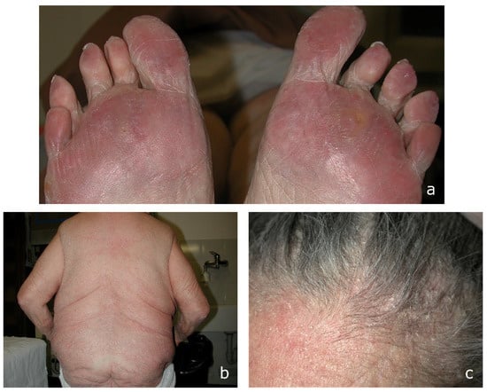 A 69-year-old, female, Caucasian, with rheumatoid arthritis: (a) sole and toenail hyperkeratosis; (b) extensive erythema on lower back area diagnosed as psoriasis; and (c) scalp with flaking dandruff and thinning hair.