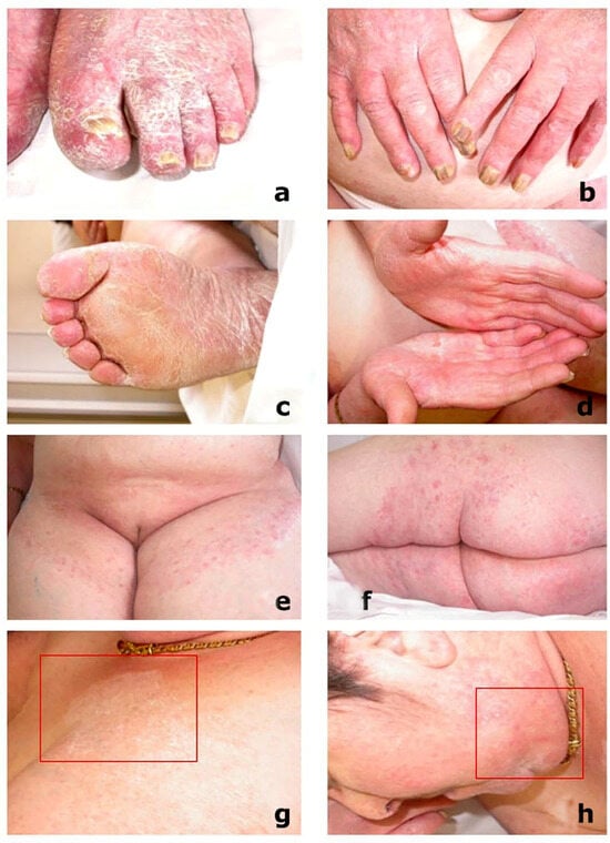 A 68-year-old, female, Caucasian, with rheumatoid arthritis: (a,b) lamellar toenails and fingernails desquamation; (c,d) sole and palms hyperkeratosis; (e) scaling lesions in the abdomen and inguinal area; (f) buttocks and thighs; (g) neck; and (h) chin previously diagnosed as psoriasis (scaling lesions).