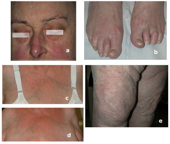 A 74-year-old, female, Caucasian: (a) face erythematous lesions previously diagnosed as contact dermatitis; (b) distal onycholysis on the toenails and signs of desquamation on the dorsum of the foot; (c,d) neckline and back extended erythema; and (e) leg scaling lesions.