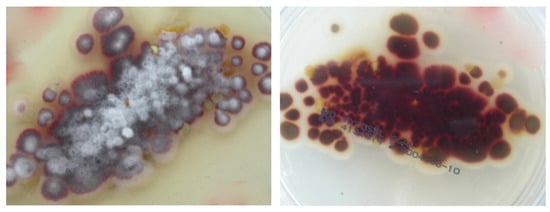 Fungi were initially identified using a macroscopic and microscopic examination of colonies and asexual reproductive structures at the Bacteriology and Mycology Laboratory, Department of Public Health and Pediatrics, Microbiology Division, University of Torino (Italy) [19]. On a microscopic examination of the colonies, there were a few teardrop-shaped microconidia along the septate hyphae. Incubation on plates resulted in downy white colonies with a brownish-yellow (Figure 7; Patients 1, 2, and 5) or deep wine-red reverse pigment (Figure 8; Patients 3, 4). On the basis of the macroscopic and microscopic morphological characteristics of the fungal isolates, the strains were classified as two forms of T. rubrum in all lesions (Figure 7 and Figure 8).