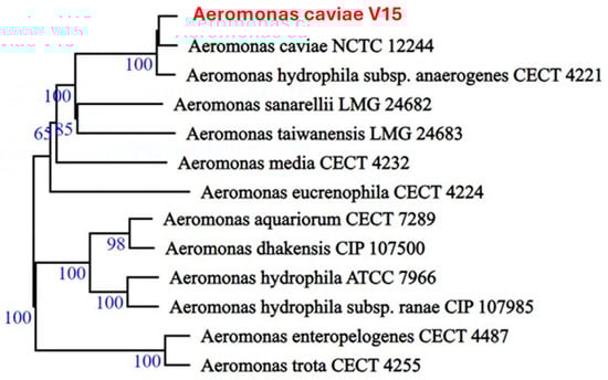 The following supporting information can be downloaded at https://www.mdpi.com/article/10.3390/microorganisms13040897/s1: Table S1: Virulence factors found in genome of strain V15T and its respective genes and other Aeromonas.
