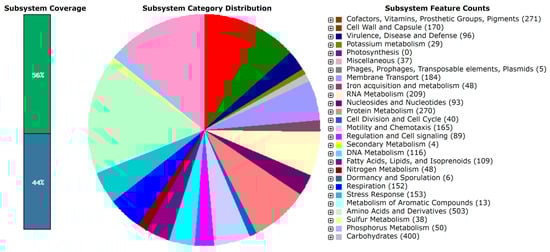 The annotation of the genome of V15T with Rapid Annotation using Subsystem Technology (RAST) identified 4028 putative coding sequences (CDSs) and 147 RNAs. An overview of the count of each feature in the subsystem and its coverage is shown in Figure 2.