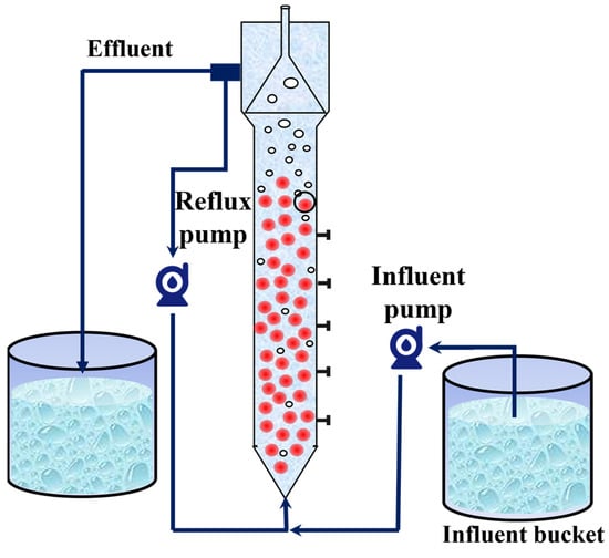 In this study, an expanded granular sludge bed (EGSB) with a volume of 10 L was used as an anammox bioreactor. The reactor was made of Plexiglas and covered with insulating foam for warmth and protection from light. The reactor was equipped with inlet and return pipes, and a peristaltic pump was used to realize the continuous inlet and return of synthetic wastewater (Figure 1). The seed sludge was obtained from Jiangsu University of Science and Technology (JUST), and the nitrogen-loading rate (NLR) and nitrogen removal rate (NRR) of the anammox reactor were maintained at 1.38 ± 0.01 kg/m3·d and 1.15 ± 0.02 kg/m3·d, respectively, after 15 days of laboratory operation.