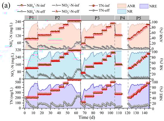 In the third phase (66–105 d), the influent ammonia nitrogen as well as nitrite nitrogen concentrations were reduced to 50.46 ± 0.60 mg/L and 65.60 ± 0.54 mg/L, respectively, to investigate the changes in the denitrification performance of the anammox reactor under low nitrogen-loading conditions. Low substrate concentration can dilute the remaining high substrate concentration in the reactor during P3 and help to eliminate the inhibition of the reactor by high nitrogen loading [24]. However, low substrate concentration in the feed water not only leads to a decrease in the mass transfer efficiency of the substrate, but also significantly alters the osmotic pressure and redox potential of the reactor, which can easily lead to the hydrolysis of biomass [23]. Moreover, the activity of AnAOB was at a low level due to the long-term inhibition by the high concentration of substrate, so ANR, NR, and NRE did not immediately recover to the pre-inhibition level at the beginning of P3. However, with continuous operation under low nitrogen-loading conditions, the performance of the anammox reaction period was effectively restored, and ANR, NR, and NRE gradually increased, NRR was effectively improved, and RS and RP gradually approached the theoretical values.
