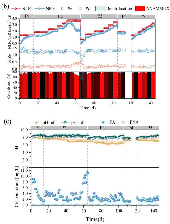 Performance variations of anammox bioreactor at different stages (P1–P5). (a) Ammonia nitrogen removal (ANR), nitrite removal (NR), total nitrogen (TN), and total nitrogen removal efficiency (NRE). (b) Changes in nitrogen removal rate (NRR), nitrogen-loading rate (NLR), stoichiometric ratios (Rs and Rp), and nitrogen removal contribution. (c) Changes in reactor pH and free ammonia (FA) and free nitrite (FNA) content.