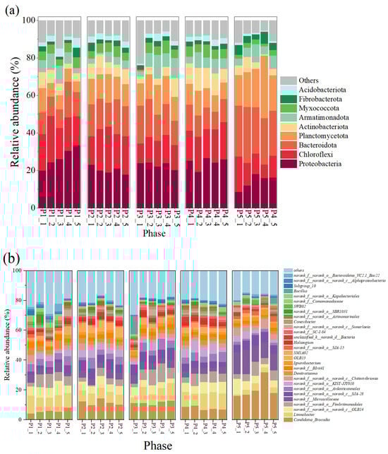 At the phylum level (Figure 3a), Proteobacteria, Chloroflexi, and Bacteroidota and Planctomycetes, as the major bacterial phyla in this reactor, maintained high abundance in all phases, respectively, ranging from 14.16 ± 3.40% to 26.82 ± 4.74%, 12.18 ± 3.73 to 20.10 ± 3.18%, 12.72 ± 3.28 to 26.06 ± 2.15%, and 8.11 ± 2.58 to 21.50 ± 6.02%, respectively. Among them, Proteobacteria contain many nitrifying and denitrifying functional bacteria that are widely present in nitrogenous wastewater, and their presence is important for nitrogen metabolism in the reactor [16,40]; members of Chloroflexi contain numerous filamentous bacteria that are commonly found in treatment plants with a primary focus on nitrogen and phosphorus removal [41]. AnAOB were the main component of Planctomycetes, which indirectly suggests an increase in the abundance of AnAOB, which is consistent with the results of enhanced nitrogen removal from anammox reactors.