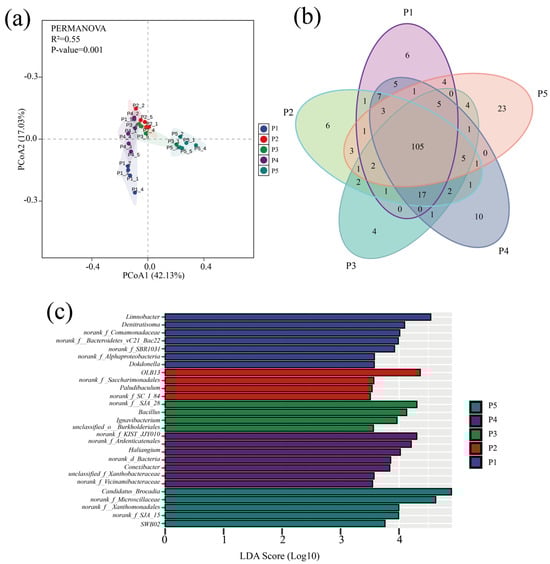 Analysis of microbial community differences. (a) PcoA analysis of microbial communities at different stages. (b) Venn diagram of genus-level distribution of microbes in samples at different stages (colors represent samples at different stages, numbers represent species contained in the samples). (c) LEfSe analysis of genus-level microbial communities in different run stages (LDA scores > 3.5).