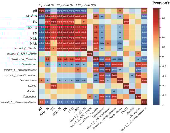 The correlations between environmental factors and significantly different microbial species in the LEfSe analysis were revealed by correlation heatmaps (Figure 5). Among them, NH4+-N, NO2−-N, TN, and NLR showed significant positive correlation (p < 0.001) with Candidatus brocadia, indicating that AnAOB can be enriched under the appropriate substrate concentration conditions, which can further increase the nitrogen removal rate of anaerobic ammonia-oxidizing reactors, and thus, Candidatus brocadia and NRR showed a significant positive correlation. In addition to the influence of physicochemical factors on the abundance of Candidatus brocadia, the competition between species should not be ignored; the reaction stoichiometry ratio consistently deviated from the theoretical value of anammox suggesting that there were other reactions involved in the de-nitrogenation process in the reactor, while Candidatus brocadia was significantly negatively correlated (p < 0.001) with the related microorganisms with denitrifying function, such as Denitratisoma, Limnobacter, etc. This phenomenon may result from partial mortality of AnAOB and other microorganisms under nitrogen-loading inhibition. The dead cells served as carbon sources, providing nutrients for denitrifying bacteria (e.g., Denitratisoma and Limnobacter), thereby increasing their relative abundance during the later phase of P2. Consequently, the contribution of denitrification to nitrogen removal was enhanced. However, during P3 and P5, despite continuous increases in nitrogen loading, the threshold tolerance of AnAOB was not exceeded. This reduced the inhibition-induced mortality of AnAOB under high nitrogen loads. Simultaneously, the decreased availability of carbon sources limited the metabolic activity of heterotrophic bacteria such as Denitratisoma and Limnobacter, leading to a decline in their relative abundance. Therefore, NH4+-N, NO2−-N, TN concentrations, and NLR exhibited negative correlations with the relative abundances of Denitratisoma and Limnobacter.