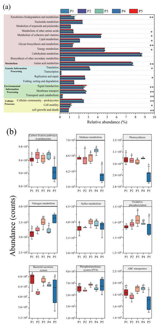 PICRUSt2 analysis of changes in microbial KEGG function during reactor operation. (a) KEGG secondary metabolic pathway (Kruskal–Wallis test, * p < 0.05, ** p < 0.01). (b) Key tertiary metabolic pathways for energy metabolism and membrane transport (Different letters indicate significant differences before and after composting.).