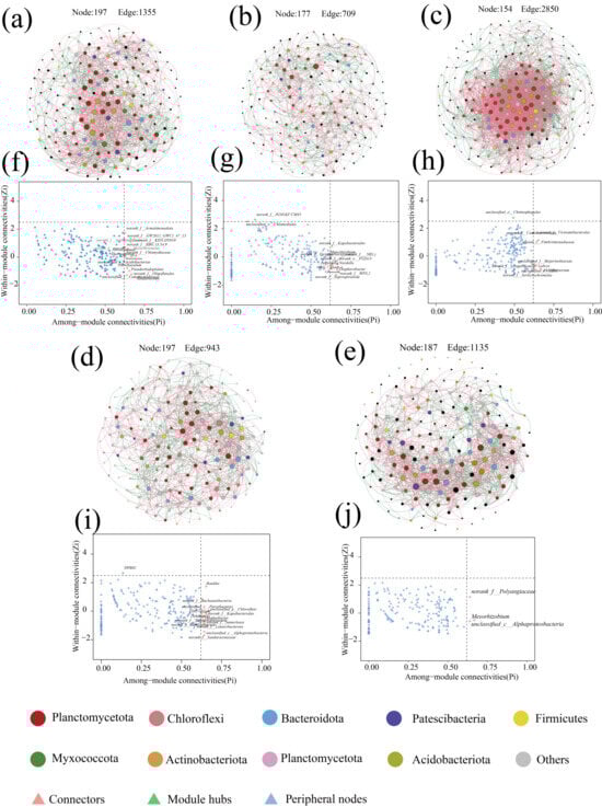 Microbial co-occurrence network analysis with network connectivity analysis. (a–e) Network diagram of microbial contribution at P1–P5 stages. (f–j) show the results of co-occurrence network connectivity for stages P1–P5. Calculated according to the SparCC correlation algorithm, the red edges between nodes correspond to a significant positive correlation (r > 0.8, p < 0.05), while the green edges correspond to a significant negative correlation (r < −0.8, p < 0.05). Node size was correlated with connectivity between microbes. zi-Pi plots show key node microbes in the co-occurrence network.