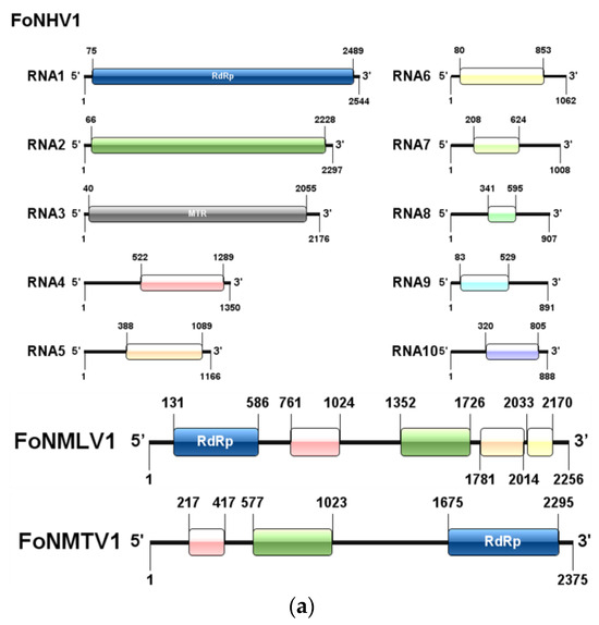 Gene structure of positive-sense single-stranded RNA viruses and phylogenetic relationships of FoNMTV1. (a) Gene structure of FoNHV1, FoNMTV1, and FoNTV1. (b) NJ phylogenetic analysis depicting the evolutionary relationships of FoNMTV1.
