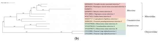 FoNMTV1 has a genome sequencing length of 2375 nt, containing three non-overlapping ORFs of 621 nt, 447 nt, and 201 nt (Figure 3a), respectively, arranged linearly within the viral genome. The largest ORF encodes the RdRp. The RdRp sequence of FoNMTV1 shows the highest similarity (64.1%) to that of the known virus Botrytis cinerea mitovirus 8 (QHJ68503.1). The RdRp sequence of FoNMTV1 was used to construct an NJ phylogenetic tree with the RdRp sequences of 10 viruses from three genera (Mitovirus, Unuamitovirus, and Triamitovirus) within the family Mitoviridae and two viruses from the family Chrysoviridae. The NJ tree revealed that FoNMTV1 clusters most closely with Botrytis cinerea mitovirus 8 from the genus Mitovirus within the family Mitoviridae, forming a distinct branch (Figure 3b). According to the classification criteria of the ICTV (where an RdRp sequence similarity of less than 70% indicates a new species of the genus Mitovirus, and combined with the results of the phylogenetic tree, FoNMTV1 is identified as a new member of the genus Mitovirus.