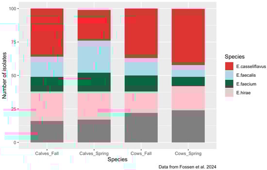 The prevalence of Enterococcus species isolated from 1505 cows and calves (743 cows, 762 calves) originating from 39 herds in the spring and fall of 2021 [12].