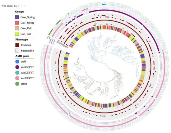 To summarize, E. casseliflavus is a prominent enterococcal species within the cow–calf sector, exhibiting notable genomic diversity among isolates. Consequently, it may be a more reliable indicator of AMR in cow herds than E. hirae, which tends to be the predominant species in feedlot cattle. Both phenotypic and genomic characterization suggest low-level resistance to key antimicrobials, including tetracycline and macrolides, which are routinely used in both human and animal medicine. While phenotypic studies identified moderate levels of resistance to quinupristin–dalfopristin in isolates from cows and calves across all time points and higher than expected levels of ciprofloxacin resistance in isolates from cows and calves in the fall, no genomic determinants were identified to account for these findings. Vancomycin resistance in E. casseliflavus was associated with a chromosomally located intrinsic resistance gene cluster, suggesting a limited role for this species in the spread of vancomycin resistance among enterococci in this sector.