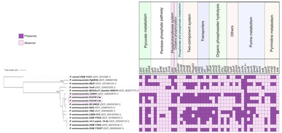 Regarding the isolates that were sequenced in this study, in the genome of P. extremaustralis PeCHP-2, the presence of 24 genes related to P-cycling was found, and while the strain PeCHP-3 has 28 genes, both strains have the majority of the genes involved in the two-component system (phoR, phoB, phoP, RegX3, and pgtA), which, under P depletion, regulates the expression of transporter genes and phosphatase genes [] and is involved with transporters (pstS, pstC, pit, and ugpC).