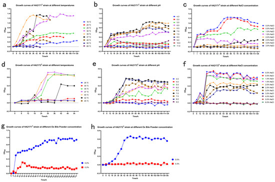 Growth curve of strains HA2171T (a–c,g) and HA2172T (d–f,h) at different temperatures, pHs, and NaCl and Ox bile powder concentrations.