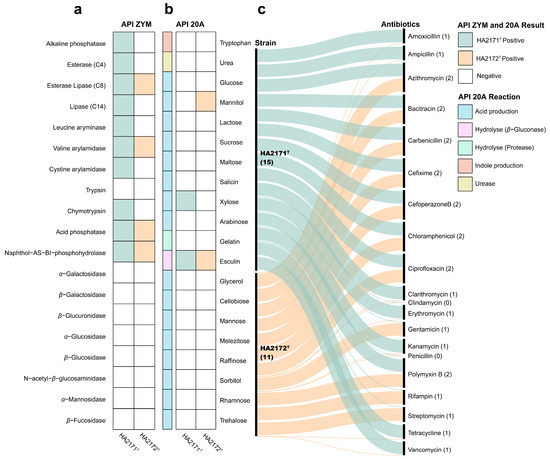 API ZYM test results for enzyme activities (a), API 20A test results for biochemical characteristics of anaerobic bacteria (b), and the evaluation of antibiotic resistance (c) of strains HA2171T and HA2172T. For (a), with the color green and orange representing the ability of enzymes for substrates conversion activity, while white represents the inability to convert them. For (b), the color green and orange represent the ability to utilize substrates for acid production, indole production, hydrolysis reaction, and urease activity, while white represents the inability to utilize them. For panel (c), this section shows the resistance of the strains to 20 antibiotics, with the number of strains in parentheses.