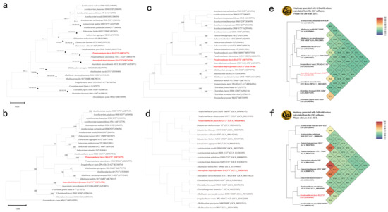 Phylogenetic analysis of strains HA2171T, HA2172T, and their closely related type strains within the family Eubacteriaceae [32]. For (a), a phylogenetic tree constructed with the NJ method based on the 16S rRNA sequences of strains HA2171T, HA2172T, and the closely related type strains within the family Eubacteriaceae. Dysosmobacter acutus MSJ-2T was used as an outgroup. Sequences were downloaded from GenBank. Filled circles indicate branches that were also found in trees generated with the ML and MP algorithms. Numbers at branch nodes represent confidence levels (values > 70% are shown) from 1000 replicate bootstrap samplings, followed by the number of NJ/ML/MP. For (b,c), phylogenetic trees of HA2171T and HA2172T based on the 16S rRNA gene constructed with maximum-likelihood (b) and maximum parsimony (c) methods, Dysosmobacter acutus MSJ-2T was set as the outgroup. Numbers at branch nodes represent confidence levels (only values ≥ 70% are shown) from 100 replicate bootstrap samplings. Displayed in d is a phylogenomic tree of HA2171T and HA2172T (d), and a phylogenomic tree of strains HA2171T and HA2172T displaying the positions of HA2171T, HA2172T, and their phylogenetically closely related neighbors (top 10 to HA2171T, the range of the 16S rRNA gene identity was 87.6–97.1%; and top 10 to HA2172T, the range of the 16S rRNA gene identity was 90.6–97.7%). e and f display ANI heat maps based on whole genomes of HA2171T (e) and HA2172T (f). GenBank accession numbers of the genomes are shown in parentheses. The red portion of the figure highlights the two novel species identified in this study.