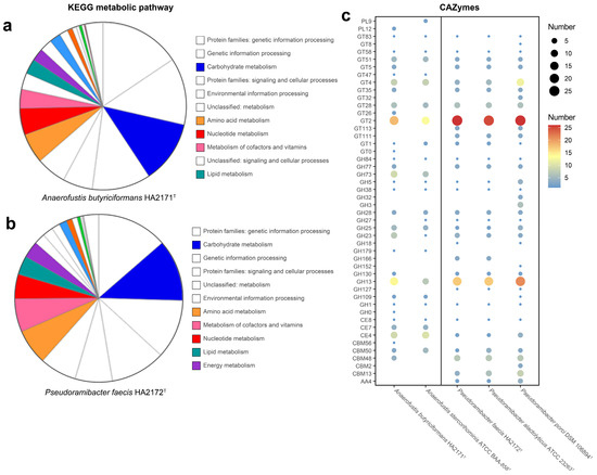 KEGG metabolic pathway of strains HA2171T (a) and HA2172T (b). Distribution of carbohydrate utilization-related genes in the genomes of strains HA2171T, HA2172T, and closely related species (c). For (c), the circle size corresponds to the number of CAZymes, with larger circles indicating a greater number.