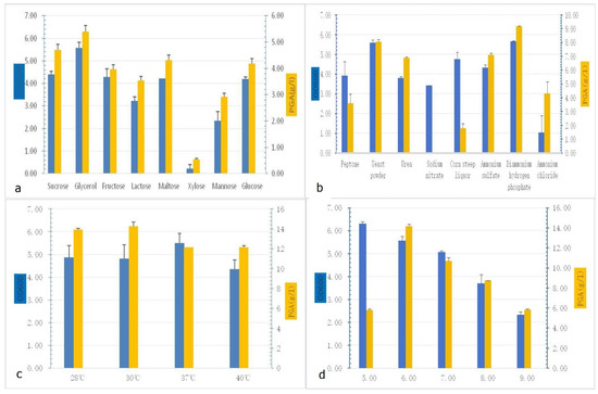 Selection of factors required for γ-PGA production: (a) γ-PGA production of different carbon sources; (b) γ-PGA production of different nitrogen sources; (c) γ-PGA production of different temperatures; (d) γ-PGA production of different pH values.