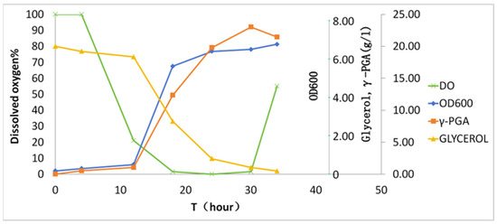 Kinetics of γ-PGA biosynthesis in batch fermentation. The x-axis denotes cultivation time; the y-axis shares a unified scale for glycerol and γ-PGA given their similar magnitude ranges.